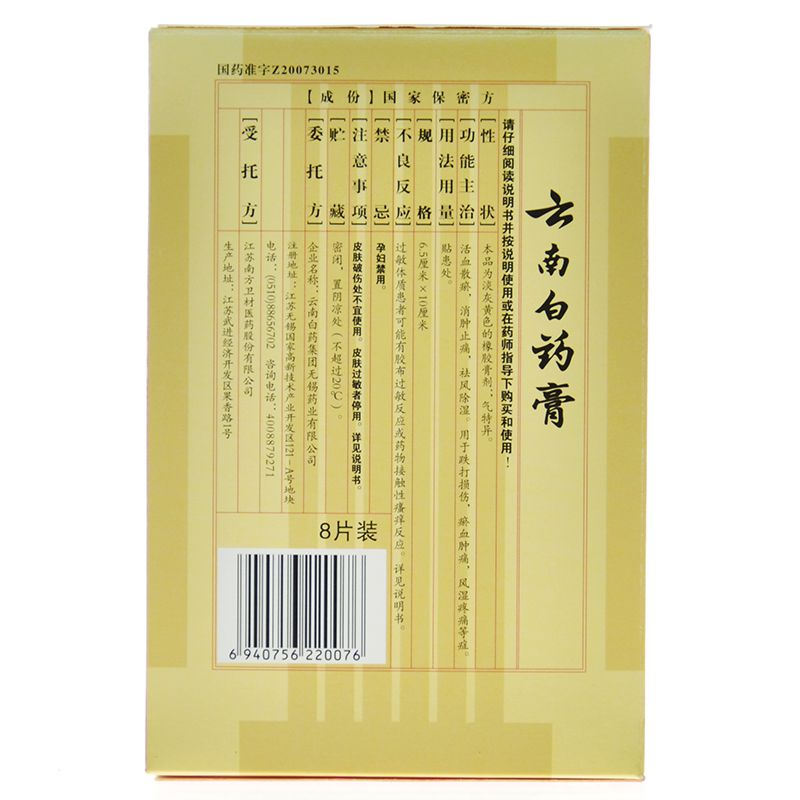 • 产品名称:云南白药膏8片