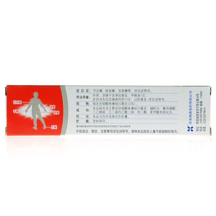 规 格 每克含硝酸咪康唑20毫克。(2%)